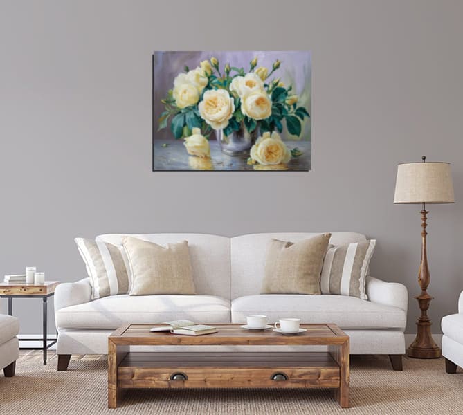 Очарователно произведение на съвременното изкуство, което излъчва елегантност и нежност чрез изяществото на кремави рози, разцъфтели в изискана сребърна ваза. Създадена с помощта на 3D маслен релеф, картината възпроизвежда всеки детайл – от текстурата на венчелистчетата до отражението в съда, създавайки усещане за дълбочина и реалистичност.